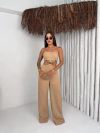 O top faixa possui caimento estruturado, duplo forro, alça dupla com amarração no pescoço e laterais franzidas que garantem ajuste perfeito. O recorte frontal é unido por uma argola dourada exclusiva, trazendo charme e um toque glamouroso ao look. A calça de alfaiataria possui pernas amplas, cós alto e caimento fluido, criando uma silhueta alongada, elegante e poderosa.